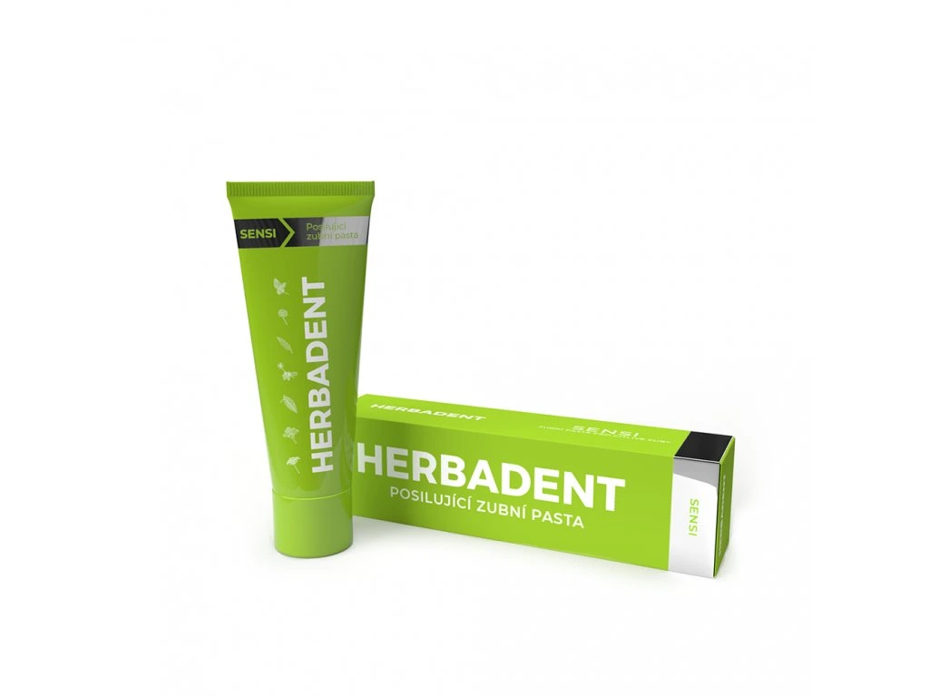 Bylinná zubní pasta HERBADENT SENSI pro dlouhodobou úlevu od citlivosti zubů. Obsahuje vyvážený bioaktivní komplex hydroxyapatitu s optimálním podílem vápníku, který posiluje zubní sklovinu a uzavírá obnažené dentinové tubuly. Má příjemnou bylinnou chuť a jemnou pěnivost.